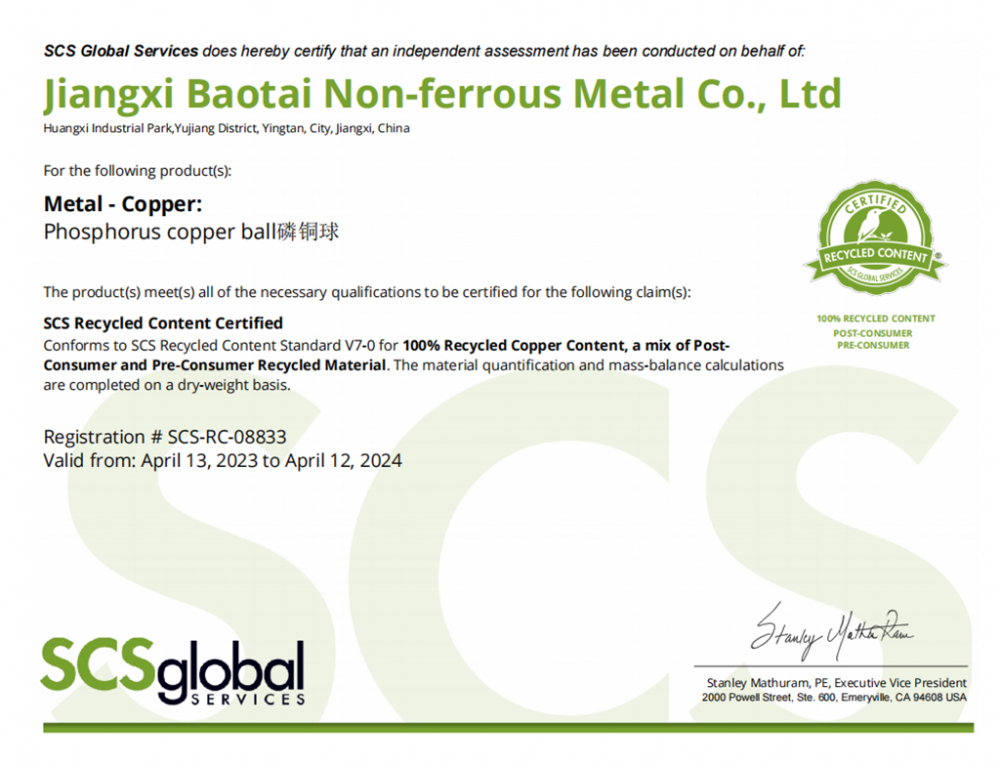 First, it has passed the Kingfisher logo certification and set group standards. The microcrystalline phosphor bronze balls, phosphor bronze balls and copper corners (rods) produced by the Group have all obtained the "SCS Global Services Kingfisher Mark - Recycled Content Certification". The group has joined forces with Yingtan Inspection and Certification Institute and other copper industry companies to publish the "Jiangxi Green Ecological Brand Building Promotion Association Group Standard T/JGE/0021-2022 Jiangxi Green Ecological Anode Phosphorus Copper Balls", which requires enterprises to assume responsibility for recycling and resource utilization after product disposal, and it is appropriate to use product recycling electronic tags, Internet of Things and big Data technology means to establish a verifiable, traceable green recycling system.